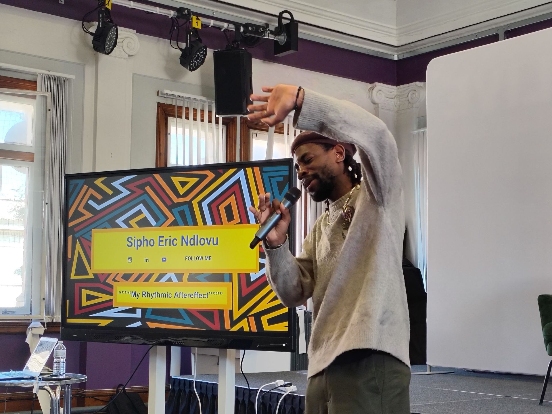 Siphi explained how music and musicality have been a source of freedom for him, helping him to overcome the challenges of a speech impairment in his youth. He reflected on the barriers he has faced, including a lack of support from some employers, while emphasising that everyone is different and unique. During his session, Siphi presented two pieces combining video and live poetry. The first focused on how dance can help break a mindset of chaos and included video footage of Birmingham. His second presentation, titled “Recode”, explored his experiences of dyslexia.