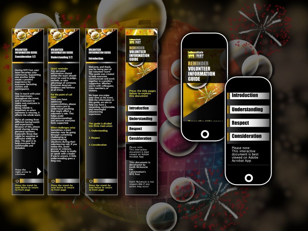 A specially made interactive digital document was developed exclusively for the volunteers and key participants of NYE Fest. It was designed to provide consistent standards for interpersonal qualities and an improved support structure.