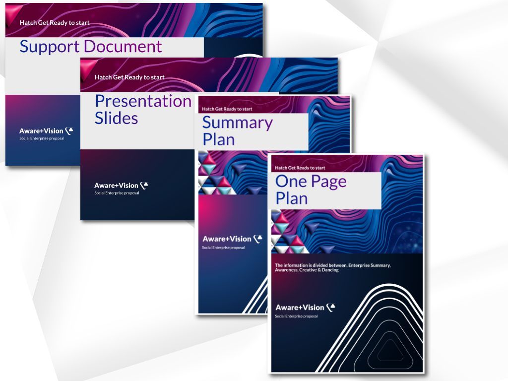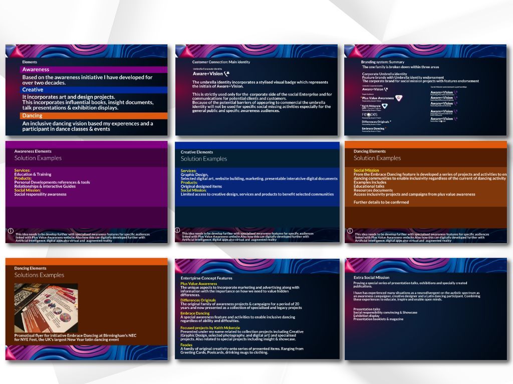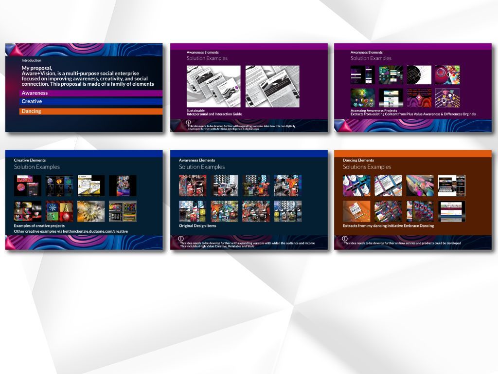 Due to the multi-purpose nature of my enterprise proposal, Aware+Vision, I have also developed a series of multi-page documents, including a “Summary Plan”. This was divided into sections: Awareness, Creative, and Dancing, each containing key information such as target audience, short-term objectives, and value proposition.